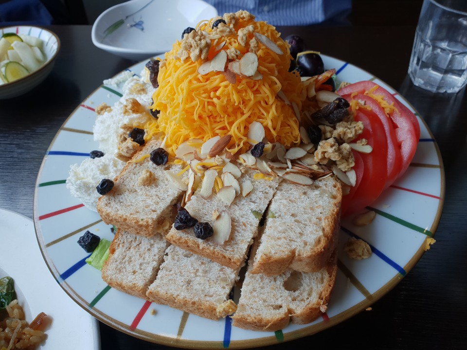 리코타 그릴 새우 샐러드. 새우가 사진 뒤와 밑에 숨겨져 있을뿐 없는 것은 아니다. 새우가 비린 맛이 나지 않아서 좋았다. 샐러드에서 중요한 것은 신선도인데, 신선도를 잘 지켜준 음식이라서 만족했다. 리코타 그릴 새우 샐러드의 전체적인 평은 다른 레스토랑에서도 쉽게 맛볼 수 있는 맛이다. 그런데 올리브와 바삭한 그래놀라가 샐러드와 잘 어울려서 색다른 메리트가 있었다. 소식가에게는 이 샐러드 하나만 먹어도 배가 든든할 정도다. 금액은 9,500원.