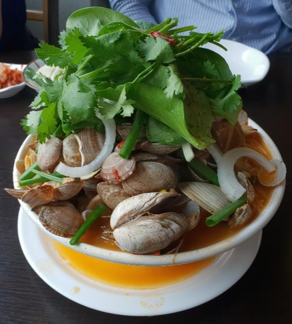 해산물 쌀국수. 조개가 많아서 가장 양이 없어 보이지만, 절대 그렇지 않다. 밑에 얇은 면발의 쌀국수가 아주 많이 들어있다. 조개도 신선하고 조개살도 두툼하다. 그런데 크나큰 실수를 했다. 음식을 주문할 때 설명을 못들었다. 여기에는 고수가 들어 있다. ㅠㅠ 고수는 빼달라고 해야된다. 고수만 입에 안넣으면 정말 맛있다. 국물도 얼큰하다. 오래 매운 맛이 아니다. 먹을때만 매운맛이라고 할까. 지속적으로 너무 매워서 음식을 다 먹어도 매움이 가시지 않아서 물먹고, 우유먹고, 식빵먹고 하는 그런 괴로움이 없다. 금액은 8,000원. 1인 금액이지만 양은 2인분.